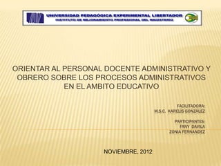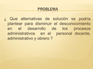 Este documento presenta posibles soluciones para disminuir el desconocimiento de los procesos administrativos entre el personal docente, administrativo y obrero en el ámbito educativo. Propone orientar al personal sobre los procesos de planeación, organización, dirección, ejecución y control, así como establecer una comunicación efectiva, estimular la autorregulación y tomar decisiones evaluando los resultados.