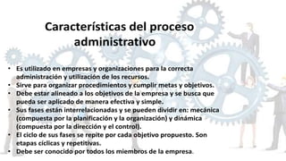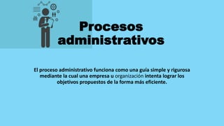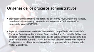 El proceso administrativo es una guía que busca lograr los objetivos empresariales de forma eficiente, detallado por Henry Fayol en 1916. Se compone de cuatro fases: planeación, organización, ejecución y control, cada una crucial para el funcionamiento de la empresa y el manejo de recursos. La importancia del proceso radica en optimizar la mano de obra y recursos, asegurando así el éxito organizacional.