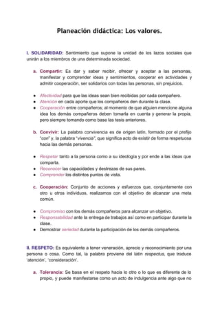 El documento aborda la planeación didáctica centrada en los valores como la solidaridad, el respeto y el compromiso. Se enfatiza la importancia de compartir, cooperar, convivir y aceptar diferentes ideologías dentro del aula para fomentar un ambiente de aprendizaje positivo. Además, se destaca la necesidad de responsabilidad y participación activa tanto de los estudiantes como del profesor para generar un sentido de pertenencia y compañerismo.