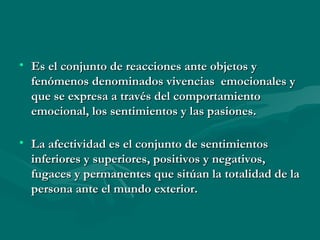 Este documento describe los procesos afectivos, incluyendo emociones, sentimientos y pasiones. Las emociones son reacciones psicofísicas de corta duración y alta intensidad generadas por estímulos. Incluye categorías como miedo, sorpresa, aversión e ira. Los sentimientos son más estables y se adquieren socialmente, como el amor o cariño. Las pasiones son estados afectivos profundos de larga duración capaces de dominar al individuo. La motivación impulsa el logro de objetivos, m