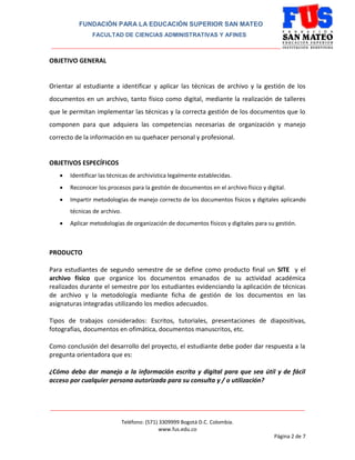 Este documento presenta un proyecto integrador sobre procesos de archivo y organización documental para estudiantes de segundo semestre de tres programas en la Facultad de Ciencias Administrativas y Afines. El proyecto busca que los estudiantes apliquen técnicas de archivo físico y digital a documentos académicos del semestre para crear un sitio web y archivo físico. Cada asignatura aporta contenido y actividades relacionadas con técnicas de archivo. El producto final será evaluado según criterios de contenido, trabajo en grupo
