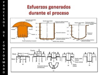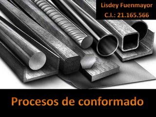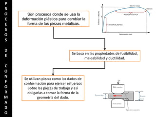 Este documento describe diferentes procesos de conformado de metales, los cuales incluyen doblado, corte, embutido, laminado, forjado y extrusión. Estos procesos usan deformación plástica para cambiar la forma de las piezas metálicas aplicando fuerzas a través de dados y herramientas. Algunos procesos como el doblado y embutido se realizan en frío o en caliente dependiendo de los requerimientos de la forma y esfuerzo necesario.