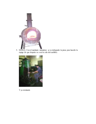 El proceso de forja de cuchillos incluye 16 pasos: 1) cortar barras de acero, 2) calentar las piezas a 1200°C en un horno, 3) dar forma a la espiga y el botón con martinetes neumáticos, 4) estampar el botón con una matriz, 5) estirar la hoja rápidamente mientras está caliente para darle forma, 6) marcar la hoja con un cuño estampado en caliente, y 7) templar y revenir la hoja para endurecerla sin quebraduras.