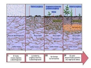 El documento describe los principales factores formadores de los suelos tropicales como el clima y la alta precipitación. Explica las ecuaciones de Jenny (1941) y Simonson (1959) sobre los factores y procesos que influyen en la formación y propiedades de los suelos. Ambas visiones son complementarias para entender los suelos como sistemas dinámicos regidos por factores ambientales y procesos internos.