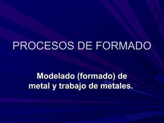 El documento describe los fundamentos del proceso de formado de metales. Explica que involucra la deformación plástica de piezas metálicas usando herramientas para cambiar su forma. Describe procesos como prensado, corte y doblado. También cubre conceptos como el trabajo en frío, tibio y caliente, y cómo la temperatura afecta las propiedades del metal como la ductilidad y resistencia. Finalmente, resume procesos comunes de formado como laminación, forja y estampado.