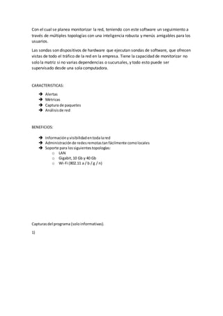 Este documento describe las funciones y tecnologías que se aplicarán a la red de una empresa para mejorar su rendimiento. Se optimizará la conectividad de red, el equilibrio de carga y la administración mediante VLAN. Esto mejorará el rendimiento sin necesidad de hardware adicional debido al uso de OpenBSD. Se utilizará el software Observer Probes de Network Instruments para monitorear puntos de red, enlaces y dispositivos.
