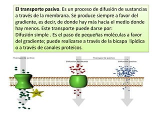 La membrana celular actúa como una barrera selectiva entre el interior y el exterior de la célula. Existen diferentes mecanismos de transporte a través de la membrana, incluyendo el transporte pasivo por difusión o difusión facilitada, y el transporte activo que requiere energía. Las moléculas grandes son transportadas a través de la membrana mediante endocitosis, exocitosis o transcitosis que implican vesículas revestidas de clatrina.