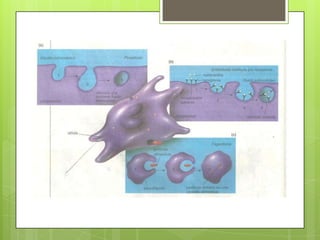 La membrana celular está compuesta de proteínas y lípidos que le dan elasticidad y resistencia. Los nutrientes y desechos pasan a través de la membrana por difusión, osmosis o transporte activo/pasivo. En medios hipotónicos la célula se hincha por turgencia, mientras que en medios hipertónicos ocurre la plasmólisis que puede causar la muerte celular. La endocitosis incluye la fagocitosis y pinocitosis para incorporar materiales, mientras la exocitosis expulsa productos
