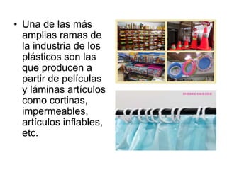 El documento describe varios procesos de plástico. Los plásticos se producen principalmente a partir de gases de petróleo y carbón. Una gran parte de la industria produce películas y láminas plásticas que se usan para artículos como cortinas, impermeables y artículos inflables. También fabrican artículos para el tocador y la cocina, lo que requiere diseñadores y estampadores. El documento luego menciona métodos comunes de moldeo como termoformado, prensa, colado en moldes e inye