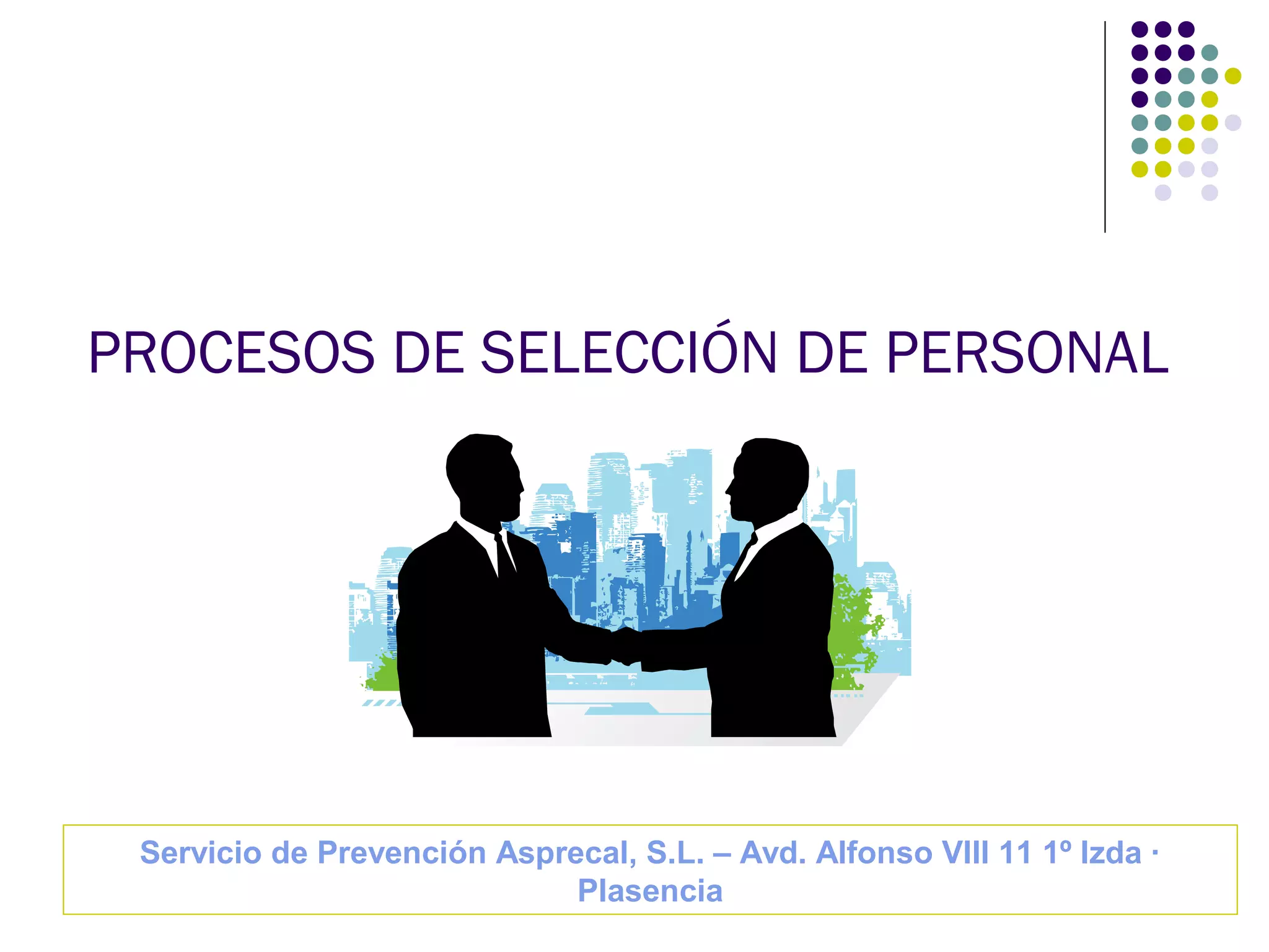 Este documento describe los procesos de selección de personal, incluyendo sus objetivos, fases y tipos de pruebas. El proceso consta de varias fases: análisis del puesto, reclutamiento, preselección, pruebas de selección, valoración y toma de decisiones, contratación e incorporación. Las pruebas comunes incluyen entrevistas, pruebas psicotécnicas, dinámicas de grupo y assessment centers, que evalúan las aptitudes y competencias de los candidatos. El objetivo final es encontrar al candidato
