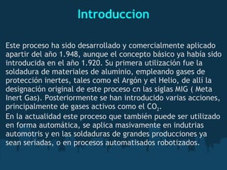 Este documento describe el proceso de soldadura MIG/MAG. Explica que se desarrolló en 1948 usando gases inertes como argón o helio para soldar aluminio. Ahora se usa masivamente en la industria automotriz y para producción en serie. Describe los componentes básicos como la fuente de poder, alimentador de alambre y torcha, así como los gases protectores como argón y dióxido de carbono que se usan para evitar la oxidación del metal fundido durante el proceso.