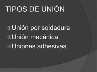 El documento describe diferentes tipos de uniones utilizadas en la manufactura, incluyendo soldadura (blanda, fuerte, por arco, fricción, ultrasonido y explosión), uniones mecánicas (sujetadores discretos e integrados) y uniones adhesivas, destacando sus características y aplicaciones. Además, se menciona la clasificación de adhesivos y se explican varios tipos de uniones específicas, como empalmadas, de esquina, superpuestas, en T y de bordes. La soldadura se detalla como un proceso que utiliza calor o presión para unir materiales, mientras que las uniones adhesivas involucran la utilización de un material externo para fijar superficies.