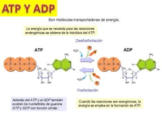 El documento describe los conceptos fundamentales de las reacciones químicas y el metabolismo desde una perspectiva energética. Explica que las reacciones requieren energía de activación para convertir reactantes en productos y pueden ser endotérmicas u exotérmicas. También describe los procesos catabólicos y anabólicos que liberan o absorben energía a través de la ruptura y formación de enlaces, y cómo esta energía se almacena y transporta a través de moléculas como el ATP.