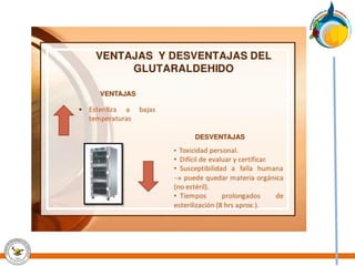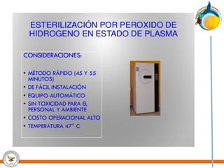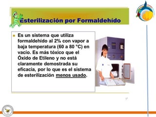 Este documento trata sobre la calidad en los procesos de esterilización. Explica que la esterilización busca eliminar todos los microorganismos, incluyendo esporas bacterianas, para obtener dispositivos seguros. Detalla los principales métodos de esterilización como vapor, óxido de etileno, formaldehído y peróxido de hidrógeno. También cubre factores que afectan la esterilización y la importancia de seguir estrictamente los procedimientos establecidos para lograr la esterilidad