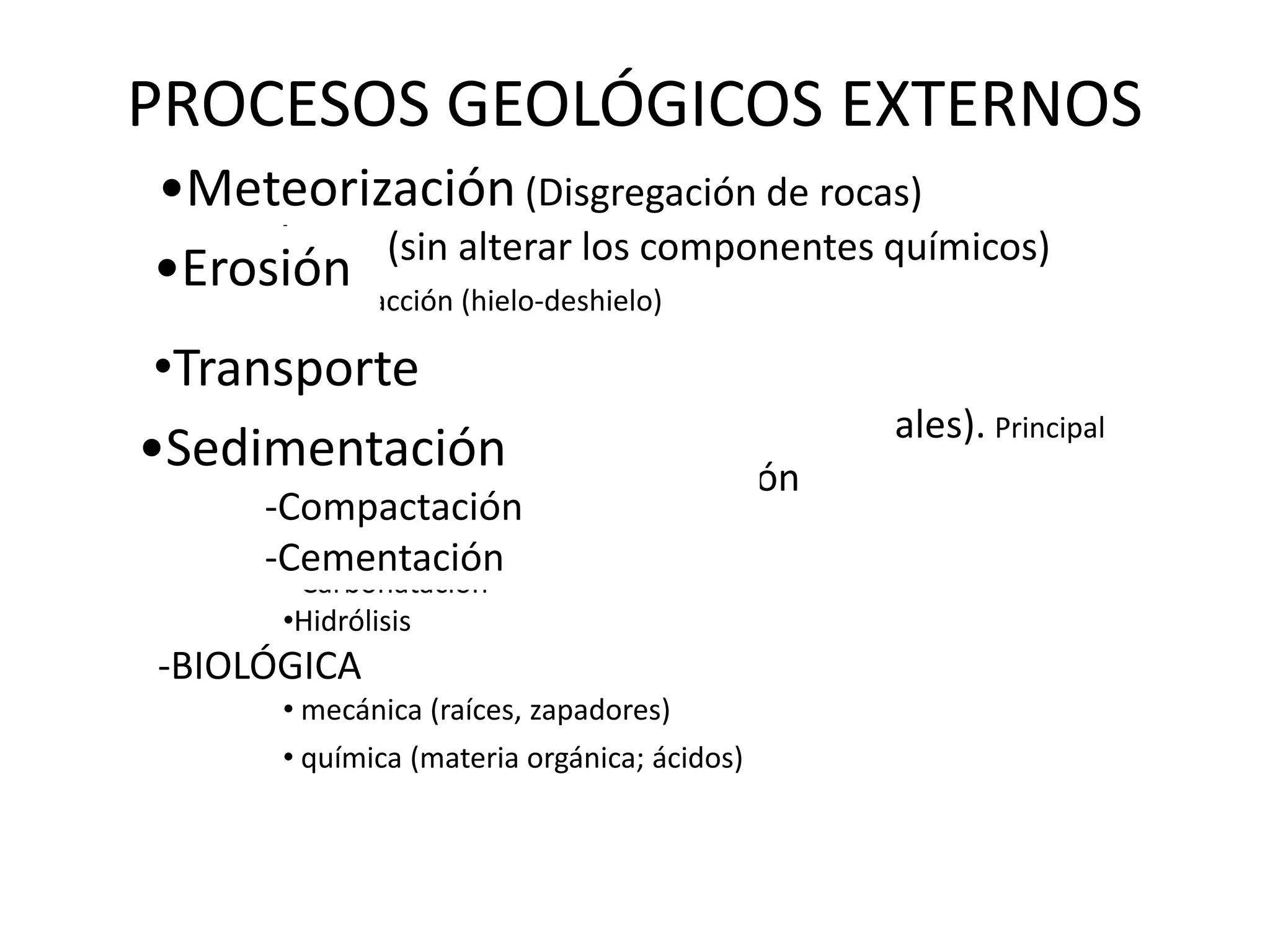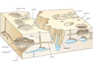 El documento describe los diferentes procesos geológicos externos que dan forma al relieve terrestre. Estos incluyen la meteorización y erosión por factores atmosféricos, hídricos y biológicos. También se describen procesos de transporte y sedimentación de materiales por ríos, glaciares, viento, aguas marinas y subterráneas. Finalmente, se mencionan formas del relieve resultado de estos procesos como valles, llanuras aluviales, dunas, acantilados y paisajes kársticos