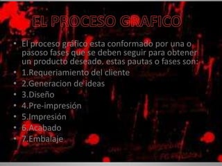 El documento describe las 7 fases del proceso gráfico: 1) Requerimiento del cliente, 2) Generación de ideas, 3) Diseño, 4) Pre-impresión, 5) Impresión, 6) Acabado, 7) Embalaje. Cada fase involucra ciertos pasos como entender los requerimientos del cliente, proponer ideas, diseñar el producto, imprimirlo, darle acabado y empaquetarlo para entrega.