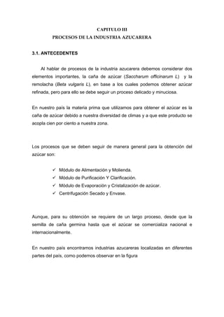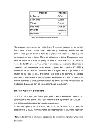 El documento describe los procesos de la industria azucarera ecuatoriana. Explica que la caña de azúcar pasa por procesos de molienda, purificación, evaporación y cristalización para producir azúcar. Los principales ingenios azucareros de Ecuador se ubican en las provincias de Guayas, Cañar, Los Ríos e Imbabura, y producen cerca del 90% del azúcar del país. El azúcar es un importante sector económico en Ecuador, empleando directa e indirectamente a más de 100,