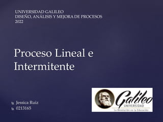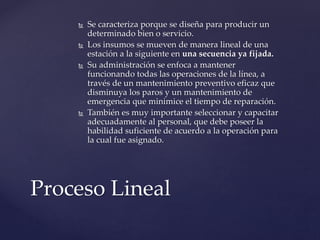 Este documento compara los procesos lineales e intermitentes. Los procesos lineales se caracterizan por producir un solo tipo de producto de manera masiva y eficiente a través de una secuencia fija de operaciones. Los procesos intermitentes ofrecen variedad de productos personalizados de manera flexible para adaptarse a cambios de mercado y nichos específicos.