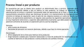 Este documento describe dos tipos de procesos de producción: procesos lineales y procesos intermitentes. Los procesos lineales se caracterizan por producir un solo producto de manera repetitiva y eficiente. Los procesos intermitentes producen por lotes en intervalos y pueden fabricar una variedad de productos, pero requieren más planificación y el personal necesita mayores destrezas.