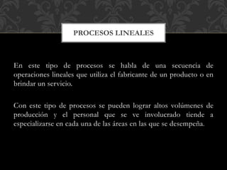 Este documento resume los procesos lineales y procesos intermitentes. Los procesos lineales implican una secuencia de operaciones lineales para producir un producto o servicio en alto volumen, lo que lleva al personal a especializarse. Los procesos intermitentes producen artículos en lotes para satisfacer la demanda irregular, requiriendo personal con mayor destreza para realizar múltiples tareas. Se proveen ejemplos como la producción de leche y llantas.