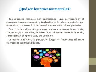 Este documento describe varios procesos mentales como la memoria, atención, percepción, pensamiento, emoción, inteligencia y aprendizaje. Explica teorías de la inteligencia como las inteligencias múltiples, la teoría triárquica e inteligencia emocional. También describe tipos de aprendizaje como receptivo, por descubrimiento y significativo, así como conceptos como sentimiento, percepción y conciencia.