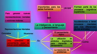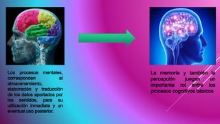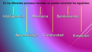 El documento trata sobre diversos temas relacionados con la psicología como la inteligencia emocional, el aprendizaje, la memoria y la creatividad. Explica que la inteligencia no solo depende de la capacidad de razonamiento sino también de los conocimientos y la capacidad de liderazgo. Además, describe diferentes tipos de aprendizaje como el receptivo, por descubrimiento, repetitivo y significativo. Finalmente, analiza conceptos como la memoria a corto y largo plazo y los procesos de codificación, almac