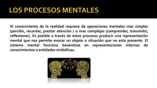 El documento describe los diferentes procesos cognitivos humanos, incluyendo la percepción, memoria, inteligencia, lenguaje, aprendizaje, pensamiento, emociones y creatividad. También resume varias teorías sobre la inteligencia como las inteligencias múltiples de Gardner, la teoría triárquica de Sternberg y la inteligencia emocional de Coleman. Finalmente, explica conceptos como el aprendizaje, la percepción, las emociones y la conciencia.