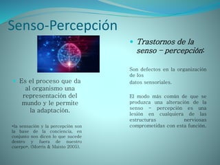 Este documento trata sobre los procesos de senso-percepción y sus trastornos. Explica conceptos como ilusión, alucinación y alucinosis. También describe la psicofisiología de los procesos mentales superiores como la percepción, conciencia, lenguaje, pensamiento, aprendizaje, memoria y placer/displacer.