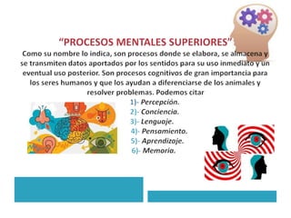 El documento resume varios procesos mentales superiores como la percepción, conciencia, lenguaje, pensamiento, aprendizaje y memoria. También describe el sistema nervioso simpático y parasimpático, y cómo regulan funciones como la digestión, respiración y reacciones al estrés. Por último, explica que el placer y displacer están vinculados a los impulsos según Freud, y que los trastornos del sistema nervioso autónomo pueden causar problemas cardíacos, de tensión arterial y otros.