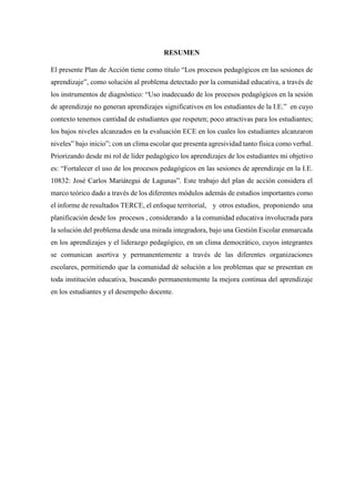 El documento presenta un plan de acción para fortalecer el uso de los procesos pedagógicos en las sesiones de aprendizaje en la Institución Educativa No. 10832 José Carlos Mariátegui en Lagunas, Perú. El problema identificado es el uso inadecuado de los procesos pedagógicos durante las sesiones, lo que no genera aprendizajes significativos en los estudiantes. El objetivo es fortalecer dichos procesos a través de estrategias como la capacitación docente, el monitoreo y acompañamiento pedag
