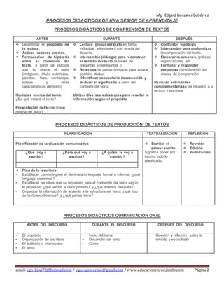 El documento describe diversos procesos pedagógicos y didácticos para el desarrollo de sesiones de aprendizaje, incluyendo estrategias de motivación, evaluación y acompañamiento en el aprendizaje. Se aborda la comprensión de textos, producción de escritos, comunicación oral, matemáticas y ciencias, con un enfoque en la problematización y el análisis crítico. Se enfatiza la importancia de activar saberes previos, formular hipótesis y reflexionar sobre el aprendizaje para fortalecer competencias en los estudiantes.