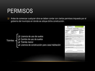 Este documento proporciona información sobre los procesos preliminares para la construcción de un proyecto, incluyendo los permisos necesarios, seguros obligatorios y consideraciones sobre mecánica de suelos. Se requieren permisos de uso de suelo y construcción del gobierno municipal. Los trabajadores deben estar asegurados por el IMSS. La estabilidad, resistencia y compresibilidad del suelo son importantes para determinar su aptitud para la cimentación. Se describen los principales tipos de suelo como gravas, arenas, limos y