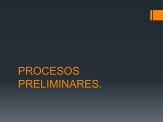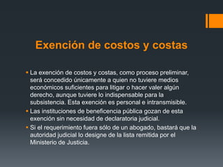 Este documento describe los procedimientos preliminares en materia legal, incluyendo la exención de costos y costas, las diligencias preparatorias, y otros procesos como el reconocimiento de firmas y rúbricas, y la exhibición de documentos. Establece los requisitos, trámites, plazos y recursos aplicables a estas medidas preliminares que pueden solicitarse antes de iniciar un proceso judicial principal.