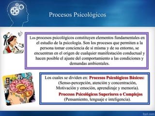 Los procesos psicológicos son elementos clave en psicología que permiten a las personas tomar conciencia de sí mismas y de su entorno, y se dividen en básicos (como la memoria, atención, motivación y emoción) y complejos (como pensamiento, lenguaje e inteligencia). Cada uno de estos procesos influye en cómo los individuos interactúan y se adaptan a sus condiciones ambientales. La memoria, por ejemplo, permite la conexión entre experiencias pasadas y presentes, mientras que el lenguaje y el pensamiento son herramientas esenciales para expresar y resolver problemas.