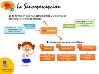 Este documento resume conceptos clave sobre sensopercepción, aprendizaje, memoria, motivación, emoción, pensamiento, inteligencia y lenguaje. Explica que la sensopercepción implica la recepción de estímulos por los órganos sensoriales y su interpretación por el cerebro. Describe los procesos de percepción olfativa, gustativa y táctil. Define la emoción, motivación y sus funciones. Explora los tipos y características del aprendizaje y la memoria. Finalmente, analiza el pensamiento