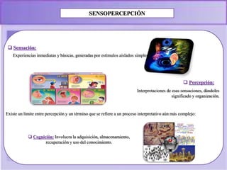Este documento trata sobre varios temas relacionados con la psicología cognitiva. Explica conceptos como la sensopercepción, el aprendizaje y la memoria, la motivación y las emociones, el pensamiento, el lenguaje y la inteligencia. Describe los procesos de codificación, almacenamiento y recuperación de la memoria, así como las teorías de la motivación y los componentes de las emociones.