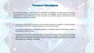 Los procesos mentales o cognitivos se agrupan en tres áreas: la captura de información (sensación, percepción y atención), la reacción (emoción y motivación) y la memoria y procesamiento de información (aprendizaje, pensamiento, lenguaje e inteligencia). La sensación implica la captura de estímulos por los sentidos, mientras que la percepción organiza e interpreta estos estímulos, y la atención selecciona información relevante. La memoria permite almacenar y recuperar información, y la inteligencia abarca habilidades como la resolución de problemas y la comunicación.