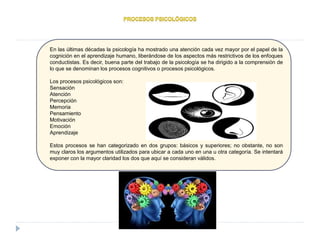 Este documento resume varios procesos psicológicos clave como la sensación, atención, percepción, memoria, pensamiento, motivación, emoción y aprendizaje. Explica que estos procesos se han categorizado en básicos y superiores. También define conceptos como conducta, conciencia, atención y memoria, describiendo sus características principales.