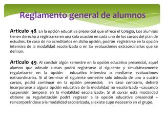 Este documento presenta las regulaciones de una escuela sobre las opciones educativas y procesos de regularización para los estudiantes. Los estudiantes tienen derecho a cursar cada materia una vez en la modalidad presencial y pueden tomar cursos intensivos u extraordinarios para regularizarse. Existen varias opciones para estudiantes con calificaciones reprobatorias que incluyen grupos de estudio, evaluaciones especiales y una modalidad de autoestudio para regularizar hasta cuatro materias.