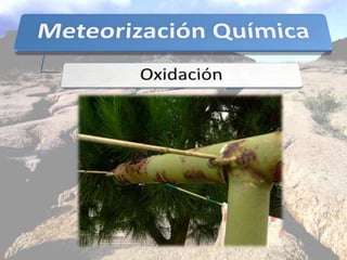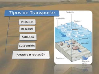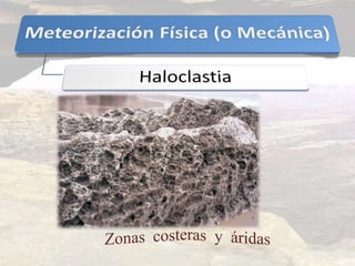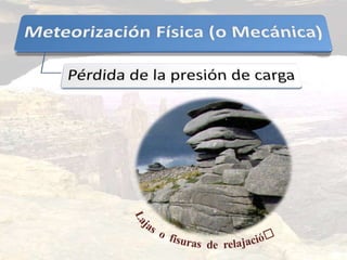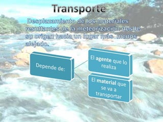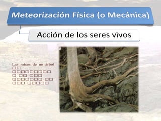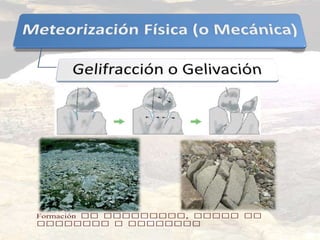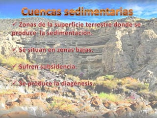 El documento describe los procesos de erosión y sedimentación en la corteza terrestre. La erosión incluye la termoclasticidad causada por cambios de temperatura y la alteración de rocas por organismos vivos y fenómenos atmosféricos. Los materiales erosionados pueden sedimentarse debido a la gravedad, precipitación química u otros procesos en ambientes como cuencas continentales, glaciares, desiertos, ríos, lagos u océanos.