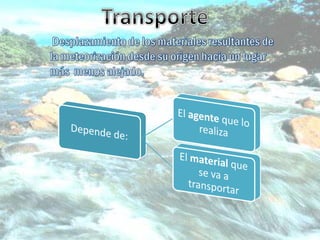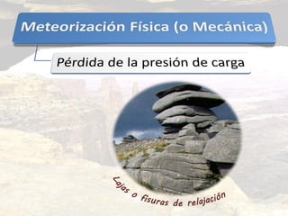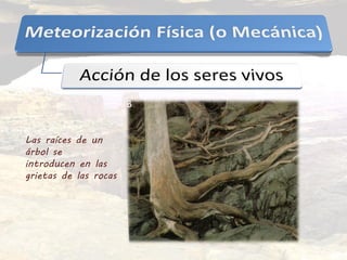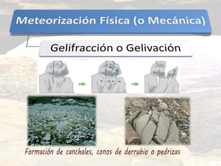 Este documento describe los procesos de erosión y sedimentación que alteran y disgregan las rocas de la corteza terrestre debido a factores atmosféricos y biológicos. La erosión incluye procesos como la termoclasticidad por cambios de temperatura, la disolución química, la erosión eólica y por oleaje, y la bioturbación por organismos como lombrices. Los sedimentos resultantes se depositan en diferentes ambientes como cuencas continentales, glaciales, desérticas, fluviales y