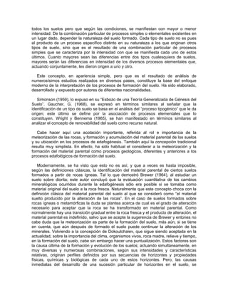 El documento describe la evolución del entendimiento científico de los procesos de formación de suelos. Actualmente se acepta que una variedad de procesos simples comunes, como la meteorización, actúan con diferentes intensidades en cada lugar para formar los suelos. Los tipos regionales de suelo resultan de combinaciones particulares de estos procesos, mientras que factores locales pueden producir variaciones dentro de una región.