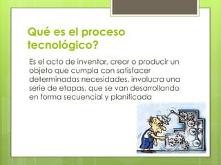 El documento describe el proceso tecnológico como el método utilizado para analizar un problema, diseñar y construir un objeto o máquina para satisfacer necesidades humanas. Explica que el proceso tecnológico involucra varias fases secuenciales, incluyendo identificar un problema, diseñar una solución, planificar los materiales y herramientas, construir el objeto, y evaluar los resultados. También proporciona un ejemplo de aplicar este proceso para crear una caja de cartón.