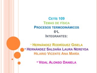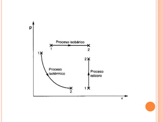 Este documento describe diferentes tipos de procesos termodinámicos como isotérmicos, isobáricos, isofónicos y adiabáticos. Explica que la termodinámica estudia las transferencias de energía térmica y cómo las primeras y segunda leyes de la termodinámica se utilizan para estudiar estos procesos y el funcionamiento de máquinas térmicas.