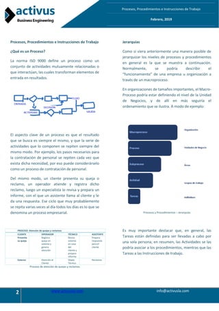 El documento presenta un análisis sobre procesos, procedimientos e instrucciones de trabajo, definiendo procesos como actividades que transforman recursos en resultados. Se clasifica los procesos en estratégicos, operativos y de apoyo, y detalla la importancia de jerarquizarlos y documentarlos para mejorar la eficiencia organizacional. También se discuten las diferencias entre procedimientos y procesos, enfatizando que los procedimientos describen de manera secuencial las acciones necesarias para realizar una actividad específica.
