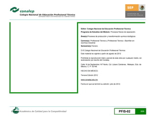 Este documento presenta el programa de estudios del módulo de "Procesos físicos de separación" para las carreras de Química industrial. Incluye mensajes del director general y del secretario de desarrollo académico, así como información general sobre las carreras, los aspectos específicos del módulo, su propósito, mapa y unidades de aprendizaje.