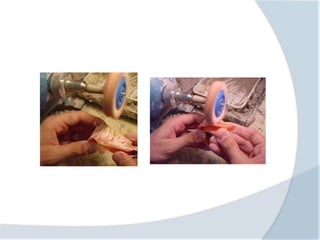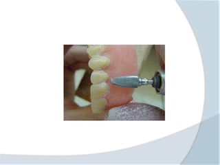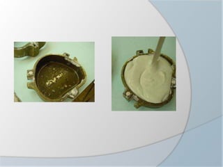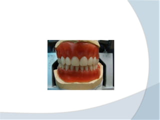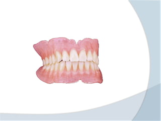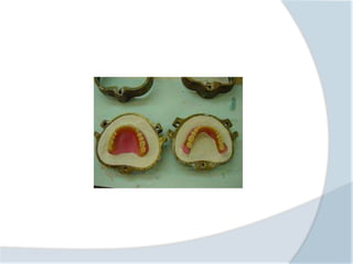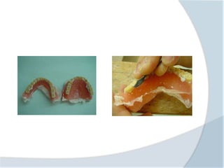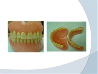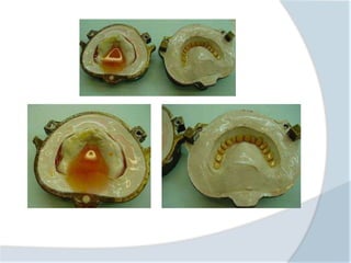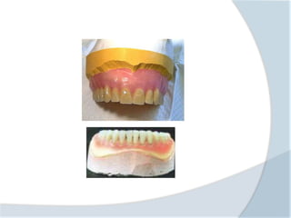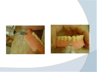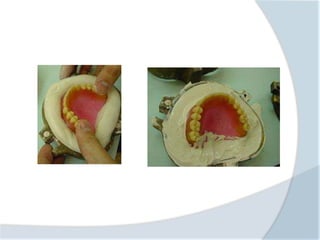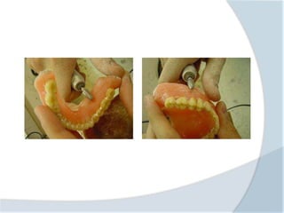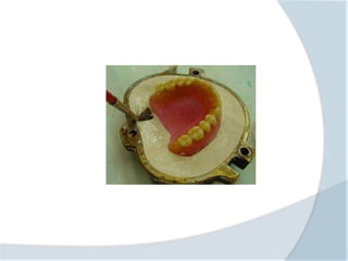 Este documento contiene información sobre diferentes tipos de yeso y acrílico utilizados en odontología, incluyendo sus propiedades, proporciones de mezcla y tiempos. También describe los pasos para fabricar una prótesis dental utilizando moldes de yeso y acrílico, como la preparación de materiales, prensado, polimerización y acabado final. Se enfatiza la importancia de la comunicación entre el cirujano dentista y el técnico para lograr la mejor calidad en la dentadura.