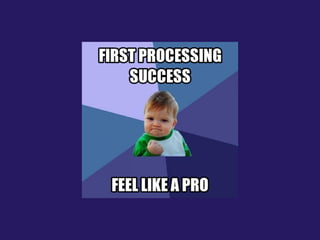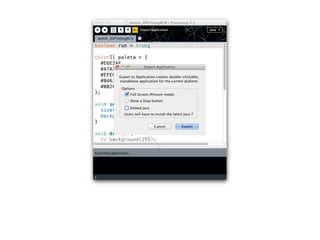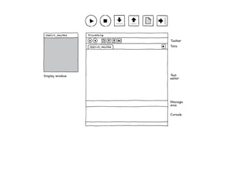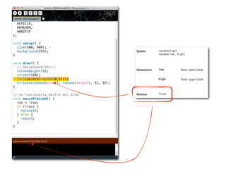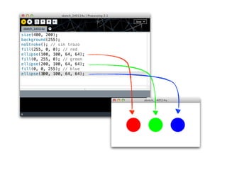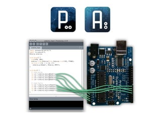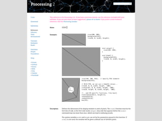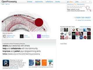 Este documento proporciona información sobre Processing, un lenguaje de programación y entorno de desarrollo utilizado para crear arte y proyectos interactivos. Processing se puede utilizar para la visualización de datos, el arte generativo, performances visuales, prototipado de aplicaciones y más. El documento también incluye enlaces a ejemplos de proyectos creados con Processing y una introducción sobre cómo dibujar formas básicas y agregar color y animación en Processing.