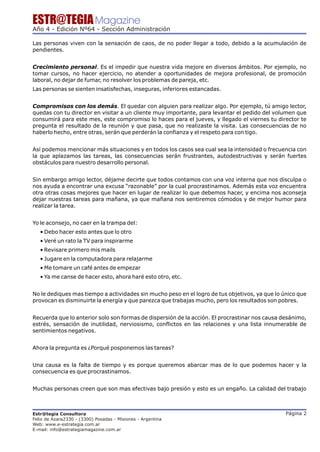 Procrastinar es posponer tareas y compromisos, lo que puede causar estrés y problemas. El artículo explora las causas de la procrastinación, como darle más importancia a los beneficios a corto plazo de evitar una tarea que a los beneficios a largo plazo de completarla. También ofrece estrategias para combatir la procrastinación, como establecer objetivos específicos, identificar los momentos más productivos del día, y priorizar tareas.