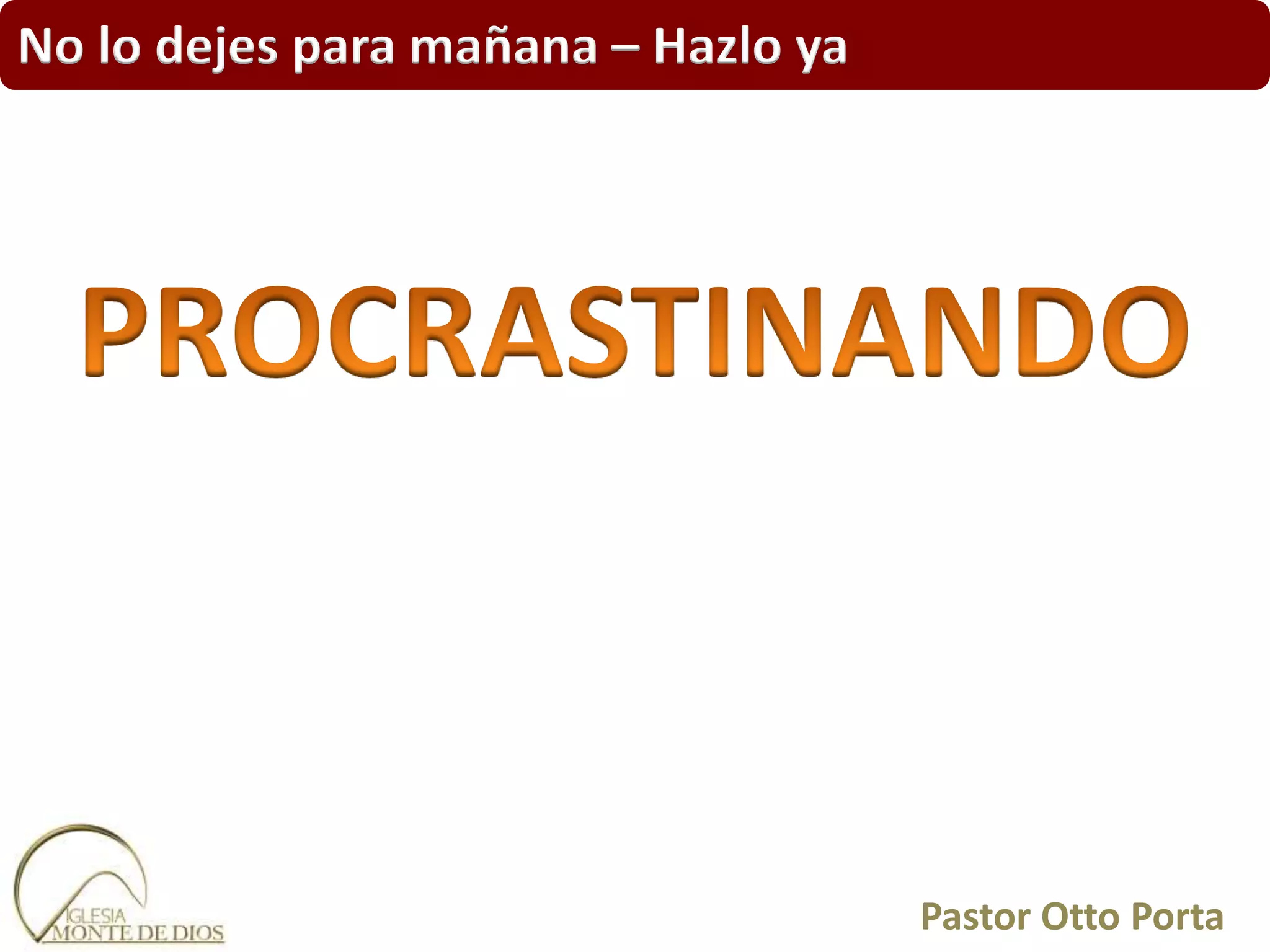 El documento enfatiza la importancia de no procrastinar, utilizando ejemplos históricos y bíblicos para ilustrar cómo la dilación puede llevar a consecuencias negativas. Se destacan diferentes formas de procrastinación y sus efectos en la vida personal y espiritual. La narrativa concluye con un llamado a la acción para afrontar las tareas y decisiones sin demora.